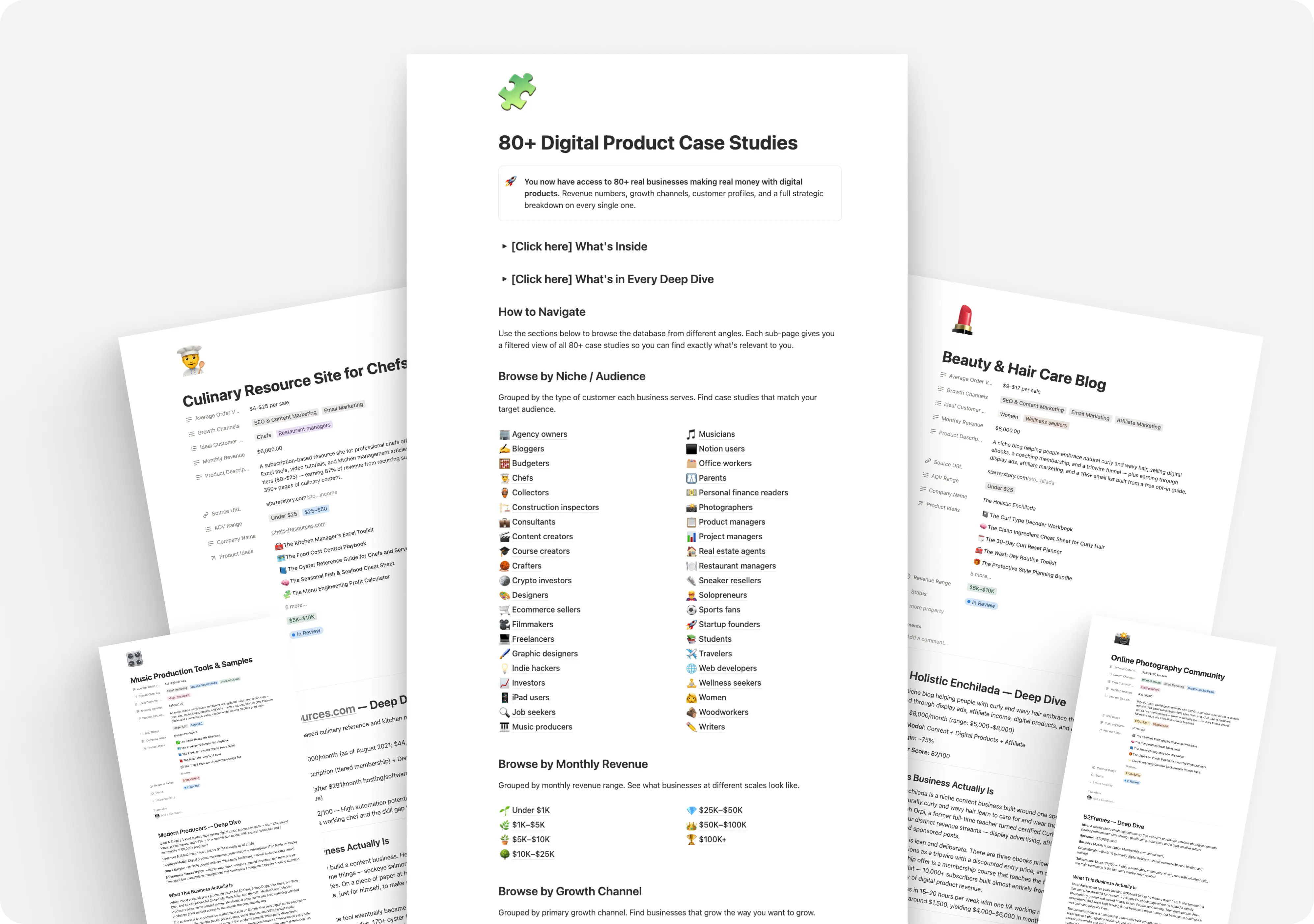A deep-dive vault of 80+ real digital product businesses across dozens of niches - what they sell, how they sell it, their revenue, their traffic, and their weak points - so you can skip the guesswork and build what's already proven.